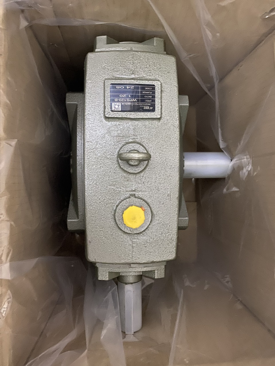 là hộp số giảm tốc dạng trục vít bánh vít wps 120 .hộp giảm tốc có khoảng cách tâm giữa trục vào và trục ra là 120 mm.trục cốt vào (trục nhỏ) nằm trên và trục cốt ra (trục lớn) nằm dưới vuông góc với cốt vào.